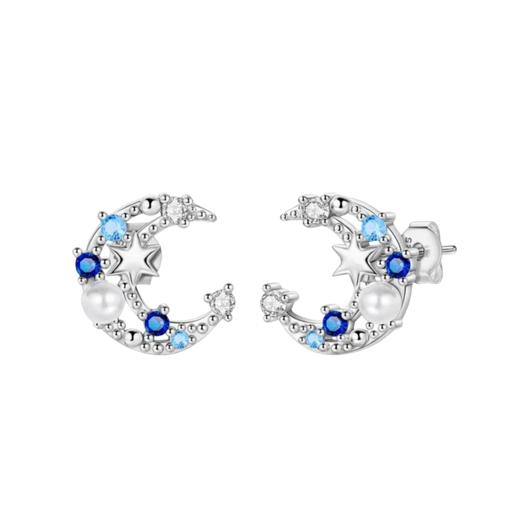 Aretes Medias Lunas Cristales Azules Y Perlas